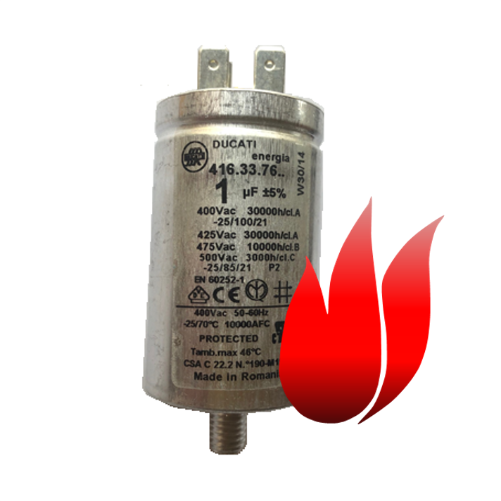 Condensateur 1uF (poêle à granulés). Le condensateur est un composant de la famille des pièces électroniques. Il existe différent types de condensateurs : stabiliser une alimentation électrique ou séparer le courant alternatif du courant continu. Dans cette version, son rôle principal est de stocker de l’énergie. Il est conçu pour emmagasiner une charge importante d’électricité et de l’accumuler.